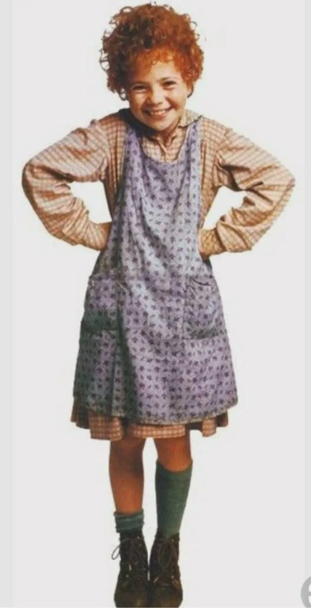 Annie - orphan scrubs with red cardigan/ brown combat boots & red/white dress black ballet flats